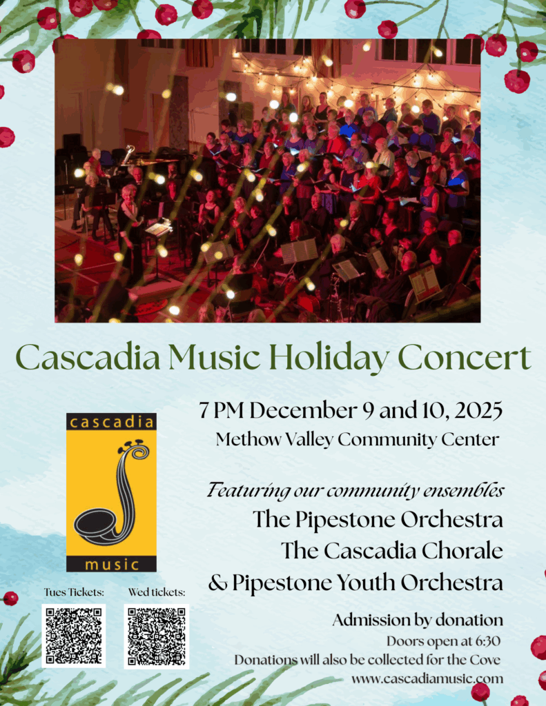 We are excited to announce : Cascadia Music’s Annual Holiday Concert, our largest and most anticipated event of the year, is coming up at 7 PM on Tuesday Dec 9th and Wednesday Dec 10th 2025 in the newly refurbished gym in the Methow Valley Community Center!